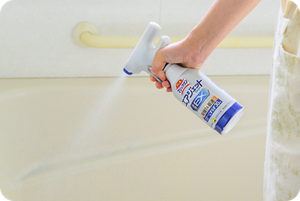 浴そう・床ヌメリにスプレー!こすらず流すだけで、すっきりキレイ。お風呂の掃除が画期的にラク&時短に!かがんでこする必要のない便利さ!もう手放せない。