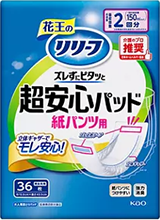 「リリーフ 超安心パッド紙パンツ用」は、紙パンツに重ねて使うことでモレを防ぐ大人用尿とりパッドです。立体ギャザーが横モレをしっかり防ぎ、幅広テープで紙パンツに密着してズレを防止。テープは繰り返し貼り直せるので扱いやすく、股下にある青い目印線のおかげでパッドの装着位置もわかりやすくなっています。さらに、全面通気シートでムレを抑え、アンモニア臭を抑える消臭機能も搭載。吸収量は最大4回分タイプがあり、長時間でも安心して使える製品です。