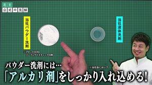 研究員「パウダー洗剤と液体洗剤は洗浄アプローチが違うので、実は配合されているものも違います。パウダー洗剤には『アルカリ剤』をしっかり入れ込めるのですが、液体洗剤だとそうはいかないんです」