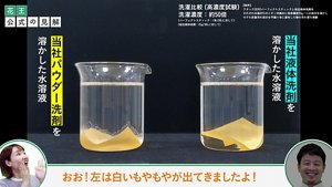 研究員「アルカリ剤をしっかり入れられると、エリソデ汚れの原因である皮脂汚れをすっきり落とせるんです! こちらの実験をご覧ください」