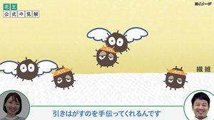 イメージとしてはこんな感じ。パウダー洗剤に含まれているアルカリ剤を「羽」に見立てます。汚れに羽が授けられると汚れ自身が変身し、変身後は仲間の汚れたちを引きはがすのを手伝ってくれるのです。