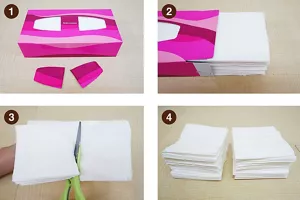 和田さんのおすすめは「ハーフティッシュ」。作り方は簡単です。BOXティッシュの取り出し口を、真ん中を残して2口に開けます。次に脇から中身を取り出し、ハサミで半分にカット。箱に戻したら、それぞれの取り出し口から出せるようにして、ハーフティッシュの完成です(作り方参照)。