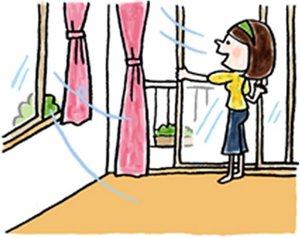 部屋に熱気がこもったままだと冷えるまでに時間がかかります。まずは窓を開けたり、換気扇を回して熱気を外に出し、その後エアコンをつけたほうが効率的です。窓は1か所を全開にするより、2か所開けたほうが風の通りが良くなります。