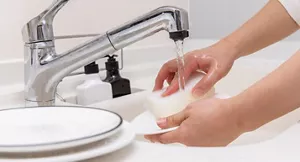 食器洗いで節水するコツは「汚れを拡散しない」「汚れを固まらせない」こと。下膳時に食器を重ねず、洗う前にキッチンペーパーやゴムベラなどで油汚れを取り除いたり、ごはん茶碗を水につけ置きすると、洗い作業が楽に手早くできます。洗う時は、水を含ませたスポンジで食器用洗剤をしっかり泡立ててから始めましょう。
