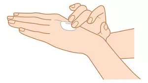 はじめに、両手指先に消毒液をすりこむのがポイント!あとは「手洗い」と同じくすみずみまですりこみます。