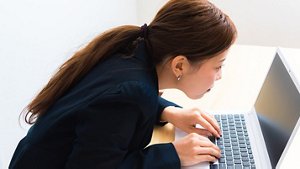 また、猫背やテーブルにもたれかかるような姿勢だとディスプレイとの距離が近くなりがちです。そうならないように、ディスプレイを置くテーブルの高さや椅子の高さを調整しましょう。