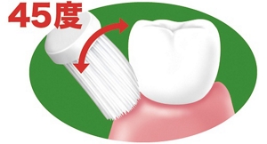 ハブラシの毛先を、歯と歯肉の境目にななめ(45度の角度)に当てて、小刻みに動かしてみがきます。