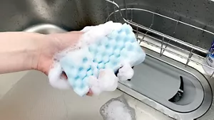 スポンジの汚れをしっかり落としてよくすすいだら、十分に水気を切ってください。