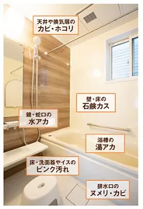 | カビ・菌 | 汚れを栄養に、ドアや浴室の隅に生える黒カビ、床や洗面器のピンク汚れ、排水口のヌメリなど、菌由来の汚れ。 |