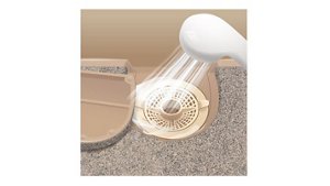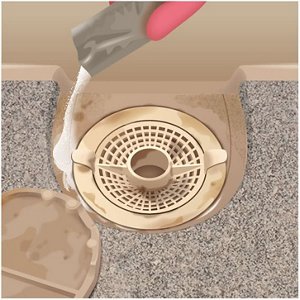 フタを外し、「強力カビハイター 排水口そうじこれだけ」を排水口の周辺にまんべんなく振りかけます。(粉が舞い上がらないよう低い位置からかけてください)