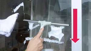 スクイージーは上から下に動かし、ひと拭きごとに付いた汚れを布でぬぐうと、仕上がりがキレイに。