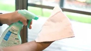 「ガラスマジックリン」や「かんたんマイペット」を古タオルなどの乾いた布にスプレーして、フレームを拭きます。2度拭きは不要です。