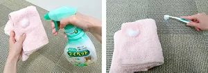 ②乾いた布に「かんたんマイペット」をスプレーし、泡の部分をシミの上にのせて、古い歯ブラシでシミの外側から内側に向けて軽くたたきます。