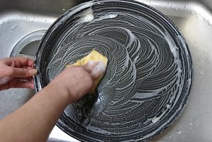フライパンに使われているフッ素樹脂加工のプレートが多いので、表面を傷つけないようにやわらかいスポンジを使います。かたいスポンジや金属製のたわしは避けましょう。