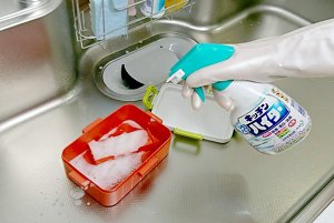 汚れがひどいときは、スプレー後しばらく置いてから、スポンジなどで軽くこすってすすぎましょう。