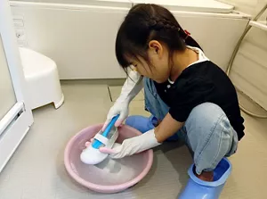 テーブル拭きや床掃除に慣れてきたら、次は水回りにチャレンジ。自分も使うものや場所を掃除すれば、「きれいにすると気持ちよく使える」体験にもなります。