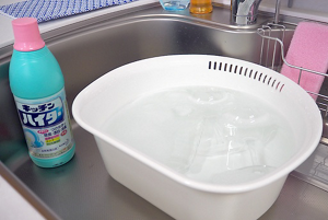 5Lの水にキャップ2杯(約50ml)のキッチンハイターを入れ、約30分つけおきした後、水で十分にすすぎ、乾かしましょう。