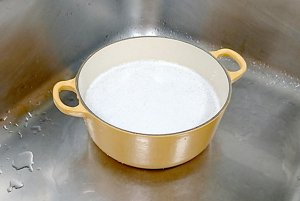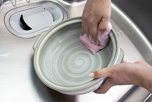 必ず、手でさわれる程度に冷ましてから、やさしく洗いましょう。油分が多い場合は、食器用洗剤「キュキュット」を使って。外側の鍋底の部分は、釉薬(うわぐすり)がかかっていないため、強く洗いすぎると傷が入ってひびの原因になるので、やわらかいスポンジで軽くなでるように洗います。