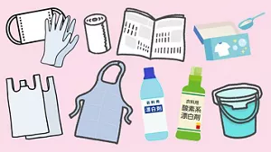 万が一に備えて、家庭内感染のリスクを減らすためにも、掃除に使うものはできるだけ使い捨てのものを使います。除菌に使う塩素系漂白剤(次亜塩素酸ナトリウム溶液)は、必ず水で薄めて使います。