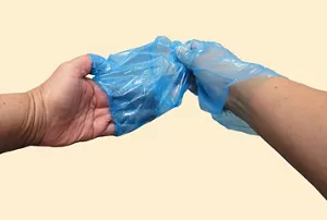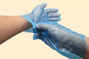 使い捨て手袋、エプロン、マスクは汚れに触れた面を触らないように外し、ポリ袋に入れ、外側の口をしっかり縛って廃棄します。