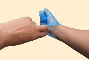 嘔吐物に触れた可能性がある手袋の外側に、なるべく触れないようにして外していきます。片方はずしたら、脱いだ手袋はもう片方の手で握って、残りの手袋を外すと一つにまとめて捨てられて安心です。