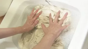 たたんだまま洗濯液に浸し、やさしく押し洗いします。