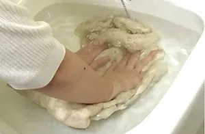 羽毛が傷むので、もんだりこすったりする洗い方は厳禁です。