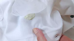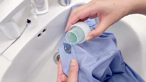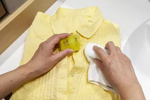 酸素系漂白剤「ワイドハイターPRO 液体」や「ワイドハイター EXパワー」の原液、または洗剤「アタックZERO」(デリケートな素材の場合は「エマール」)の原液をシミの部分に塗布し、洗剤を溶かした水かぬるま湯に約30分つけ置きしてから洗濯。