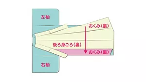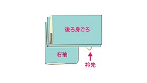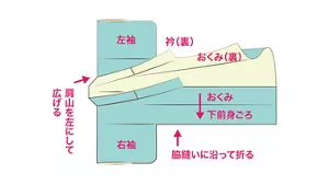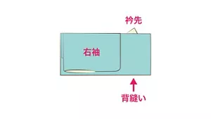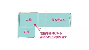 二つ折りにしたまま裏返して右袖を身ごろの上に重ねます。