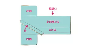 上前身ごろの脇縫いに沿って折り、上前のおくみを下前のおくみに重ねます。衿もピッタリ重ねて、 手前に倒します。