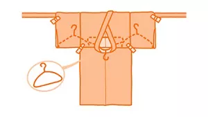 たもとの部分で二つ折りにして竿にかけ、肩縫いと脇縫いの部分を洗濯ばさみでとめます。衿と肩の部分にワイヤーハンガーを入れると、適度な重しになって、衿や肩線がピシッと型崩れなく乾きます。