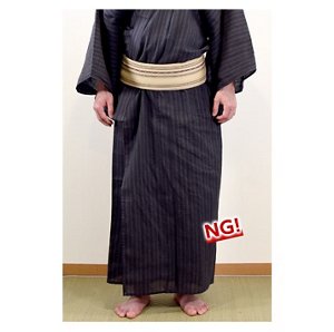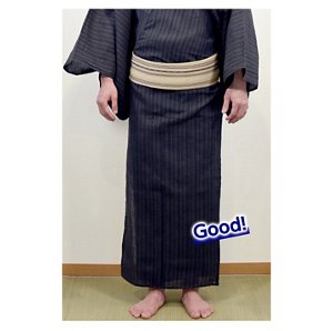 男性に限らず、着物も浴衣も裾広がりはNGです。そうならないためには、しっかりと下半身に沿うように裾を決めること。ここが決まっていないと、全体が必然的に台形の裾広がりになってしまいます。また、男性の場合には腰紐または帯一本で着ているようなものですから、緩んでこないように確実にしっかりと締めておく必要があります。