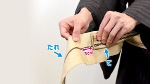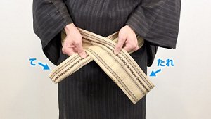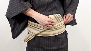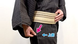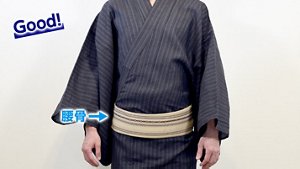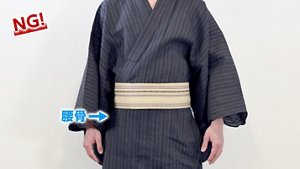 時々、帯をウエストの位置で締めている人がいますが、男性の帯は腰骨に掛けて巻いていくことが基本です。帯は低めの方が全体の着姿がバランス良く決まります。ウエストの位置に締めると裾広がりの原因にもなりますので、気を付けて。