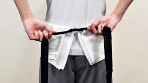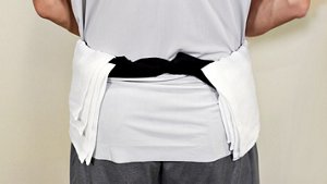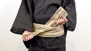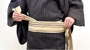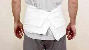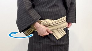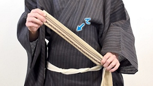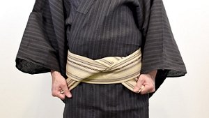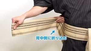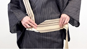 前述の腰紐、帯にも関係してくる話ですが、男性の場合は、ある程度体にボリュームのある方が収まりよく着られます。細身な人は腰紐や帯が浮いてしまう事も。そこで試して頂きたいのが、タオルの活用。ウエストから腰のあたりに巻いてボリュームを出すと全体のバランスが取りやすく腰紐や帯も安定します。