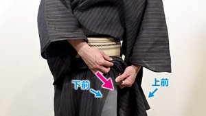 上半身が崩れて衣紋が抜けて(緩んで)きたら下前(右身頃)は左斜め下へ、上前(左身頃)は右斜め下へ引く。このとき、片方側だけを強く引きすぎると背中心がズレてしまうので、様子を見ながら左右バランス良く引くこと。また、裾が広がってきてしまった場合には同じく左右の衿先を後ろ斜め下へ引いて、浴衣を体に沿わせるようにするとリカバリできます。