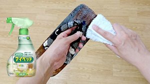 木製(白木を除く)の下駄は、乾いた布にリビング用洗剤「かんたんマイペット」をスプレーして拭いた後、水で絞った布で拭きましょう。