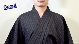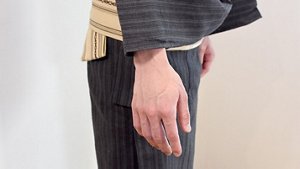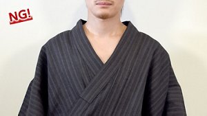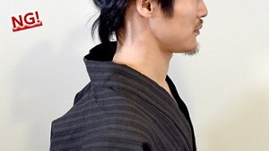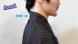 男性の場合、首の後ろ部分の衣紋(えもん)は抜かない(後ろに引っ張りすぎない)こと。抜けていて良いのは、女性だけ。案外盲点になるところです。上半身に緩みがありすぎると衣紋が抜けてしまうことがあるので、首にピッタリと添うように意識して。