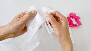 大物用洗濯ネットのサイズに合わせて、タテ・ヨコの順に屏風だたみにし、ネットに入れます。汚れのひどい部分がなるべく外側にくるように折りたたみましょう。ネットに入れることで洗濯ジワが付きにくくなります。
