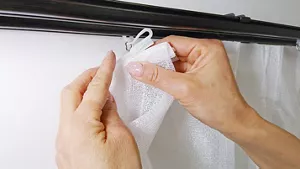 汚れを見つけやすいように、カーテンレールに掛けた状態で全体の汚れをチェックしたらレールから外し、カーテンからフックを外します。