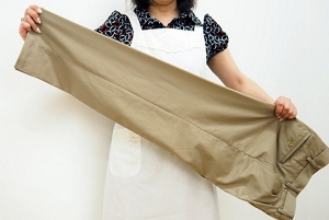 センタープレスがあるパンツ類は、折り目に沿って引っ張りながら伸ばしましょう。フリルは手で伸ばして形を整えます。
