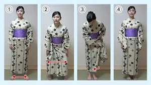 浴衣を着終わって帯を着けたら、仕上げに、①肩幅に足を開いて、②膝を左右に開き股を割り、③内側の裾の端は巻き込まず返し、④整えます。