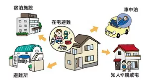 避難は、①一時的に「難を逃れる」ことと、②その後、生活基盤が落ち着くまで続く「避難生活」との2つの軸で考える必要があります。短期的な避難だけではなく、長期的な避難も含めてシミュレーションをおこない、家族や関係者間で共有しておきましょう。