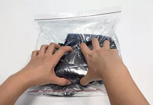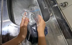 ③空気を抜いて口をきつく閉じます。もれないことを確認した上で、袋の上からやさしくもみ洗いします。もれが心配な場合は、袋を二重にするなどしてください。
