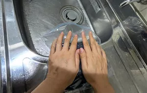 ④口を開けて排水します。洗剤液をよく絞っておくと、すすぎやすくなります。