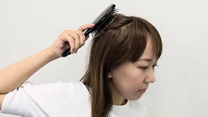 ①毛先が丸いブラシがあれば、ブラシで頭皮にたまった脂分をほぐします。生え際から頭頂部に向かってとかし、脂分や汚れを髪に移すようにします。