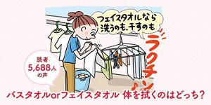 お風呂上がりに体(髪は除く)を拭くタオルについて読者に聞いたところ、バスタオルが全体の75%(そのうち13%はフェイスタオルで拭いてからバスタオルを使用)で、フェイスタオルだけの人は23%でした。フェイスタオル派の中には、「洗濯物が増えてしまう」「干す場所がない」という理由でバスタオルからフェイスタオルに乗り換えたという声も見られました。