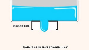 さらに注ぎ口にはもう一つ秘密があります。注ぎ口の奥の穴がひとまわり小さくなっていることによって、奥の細い穴から出た液が注ぎ口の内側につかず、スムーズに注げることができるのです。「最後のひとしぼりまで出しつくす」ための工夫です。つめかえ終わったパックを開いてみると、液体がほとんど残っていないように見えますね。