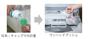 湯田:そうですね。従来のようなキャップ計量と違い、ワンハンドプッシュの場合は1プッシュで5gと出る量が決まっていて、洗たく物の量に合わせて、プッシュ回数で調節できるので、“ちょうどいい”洗剤量でお洗たくすることができます。
