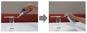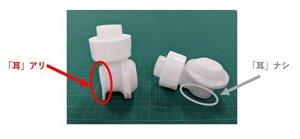 手首を強く曲げて出す試作品ノズル(左)と親指で軽く押すだけで出せるL字型ノズル(右)