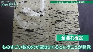 花王PR担当:続いて、第2の壁が現れます。再つめかえパックの原料となるフィルムを作ろうとすると、元のつめかえパックの印刷部分のインクやアルミが邪魔をして、フィルムに穴があいてしまうことが発覚。これはどう乗り越えたのですか?